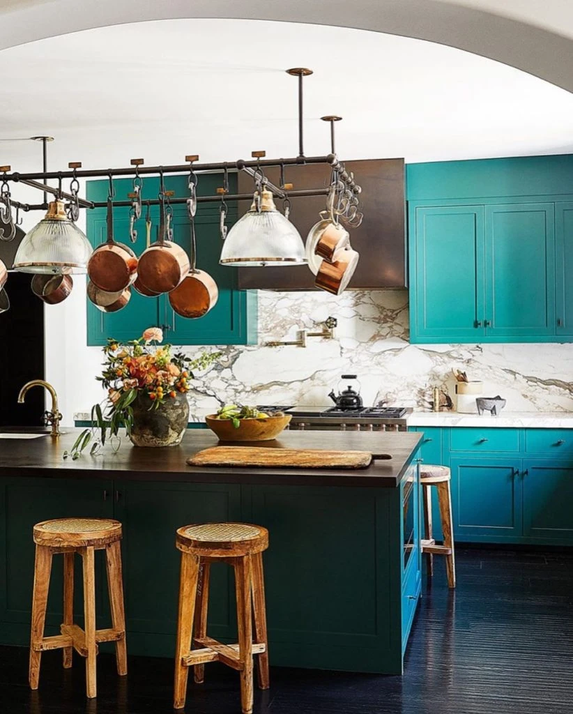 Tiene paredes de mármol y muebles en color verde, con una isla en el medio con banquetas y mesada de madera.