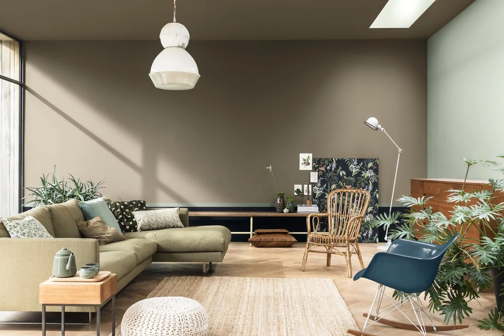 Un ambiente en Brave Ground se decora idealmente con accesorios y electrodomésticos neutros que completan la calidez encantadora de este color, ideal para livings y dormitorios.
