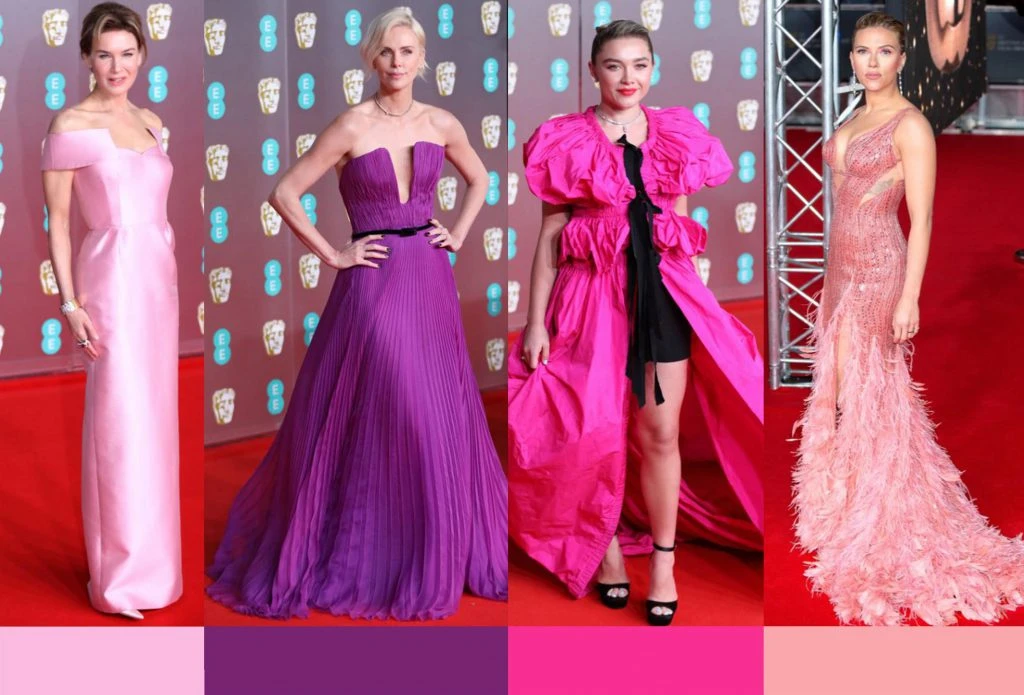 En la red carpet de los premios BATFA 2020, se destacaron los looks en tonos rosados. Charlize Theron llevó un vestido más violáceo de Dior pero Renée Zellweger usó uno bien rosa satinado de Prada. Florence Pugh, un vestido a modo de capa y satinado en fucsia, de Dries Van Noten. Y Scarlett Johansson, uno de plumas en rosa, de Versace.
