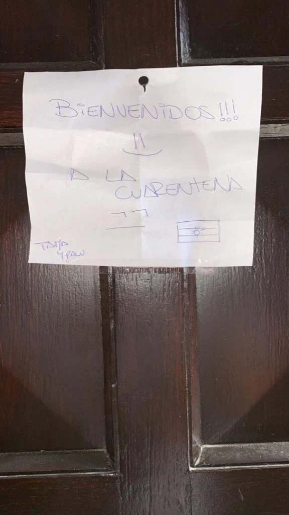 "Cuando llegamos, mi hermano nos trajo el auto. Nos esperó en el estacionamiento en otro auto, y nos saludamos de lejos. En casa, nos habían dejado provisiones para poder hacer la cuarentena y un divertido cartel de bienvenida pegado en la puerta. Ahora estamos pasando la cuarentena en casa y esperando que nadie se haya enfermado".