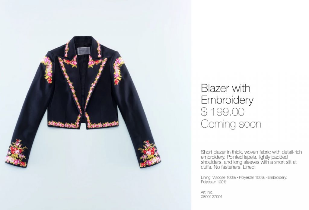 Las chaquetas y tapados bordados son divinos y tienen un precio de 199 y 349 dólares respectivamente. También hay blusas, pantalones, polleras y demás. La cápsula tiene tres líneas: una de mujer, una de hombre y otra que otra que incluye los diseños más exclusivos como el vestido de Becky G.