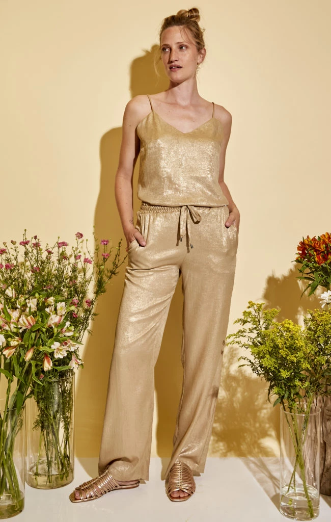 El primero de los conjuntos que en Mirta Armesto postulan para la cena de Nochebuena es full relax: pantalón de vestir (con cintura elastizada, cordón, bolsillos delanteros y tiro medio alto) y musculosa de bretel finito regulable. Lo podés combinar con unas sandalias sin plataforma ni taco.