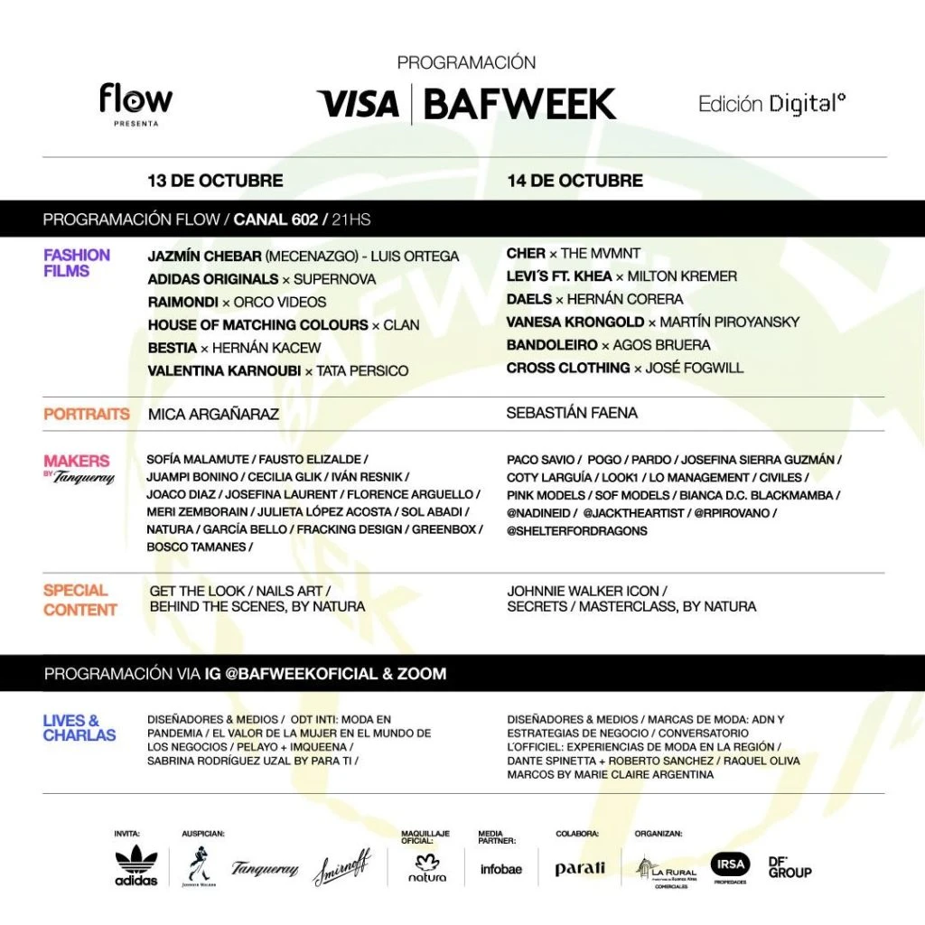 Cada vez faltan menos días para la nueva edición de VISA BAFWEEK, que no se detuvo ni por la pandemia. En su nuevo formato 100% online, el 13 y 14 de octubre empieza la semana de la moda más importante de la Argentina y tiene de todo: un exclusivo ciclo de fashion films con el making off de diseñadores y productores, contenidos audiovisuales inéditos y desfiles con las nuevas colecciones primavera verano 2021. Todo esto y más podrá verse por el canal 602 de Flow y, luego del evento, quedará disponible en la plataforma de entretenimiento para ver a demanda, desde cualquier dispositivo y en el momento que se desee.