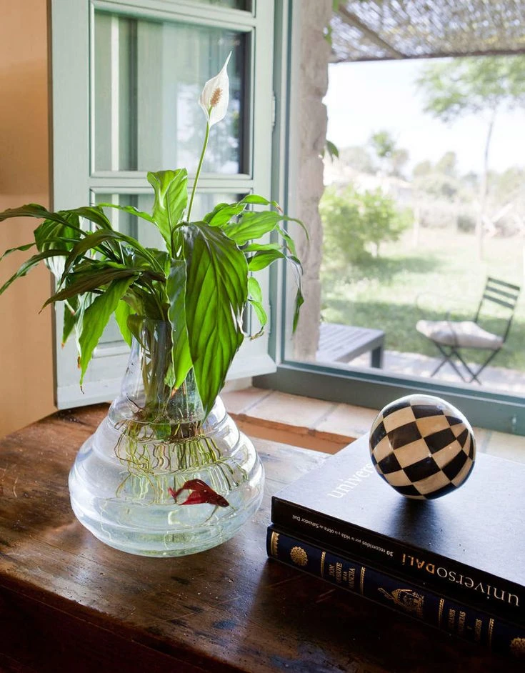 Elegante, noble y con flor. El espatifilo se adapta al agua como un duque. Eso sí, hay que sumergir solo un tercio de las raíces y cambiar el agua seguido. A cambio, te regala hojas brillantes y flores blancas que duran un montón.