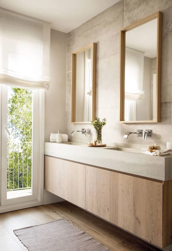 5. Para un cuarto de baño con mucho estilo, es clave incorporar materiales que se han convertido en imprescindibles en los últimos meses y que prometen seguir siéndolo en el futuro. La madera es uno de ellos, ideal para aportar ese toque de color que señalábamos antes y que le da un aspecto refrescante y revitalizador. El hormigón es otro imprescindible que encontramos en suelos y paredes, pero también en los lavabos. Ambos materiales funcionan muy bien juntos, por lo que no es necesario escoger solo uno.