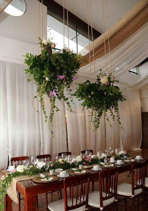 Una idea muy original y que le dará un toque especial al comedor es colocar una planta colgante sobre la mesa. Colocando bases desde el techo, será más fácil poder poner dos o tres plantas dependiendo de su tamaño o extensión.