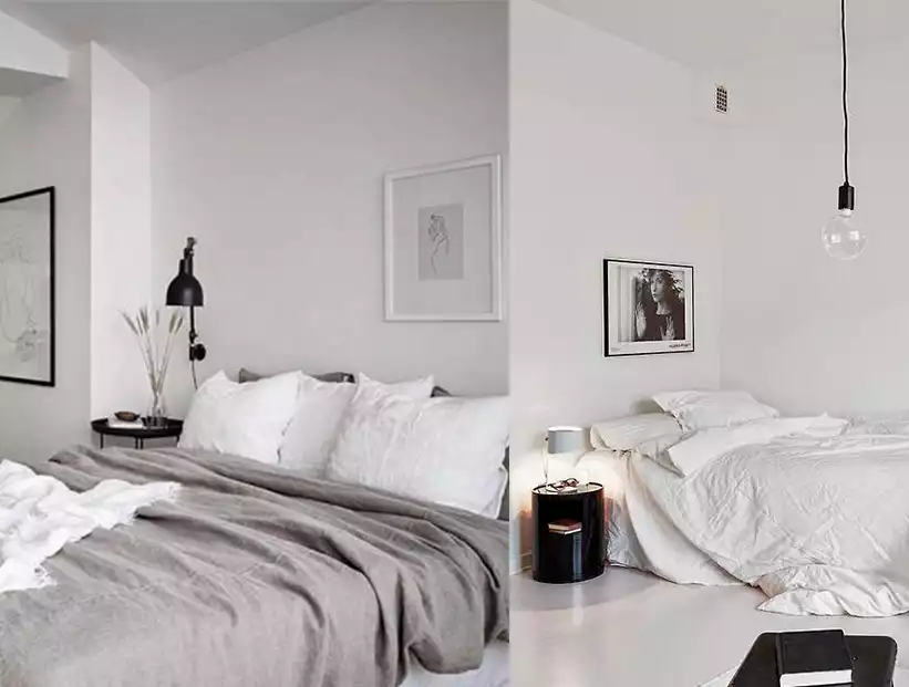 7. Añadir algún pequeño detalle en color negro, puede ser algún objeto decorativo como un espejo o velador, es clave para darle a los dormitorios el último toque minimalista.