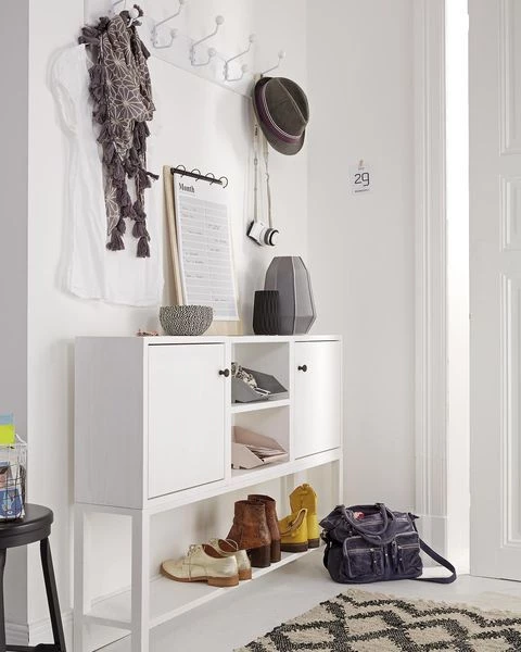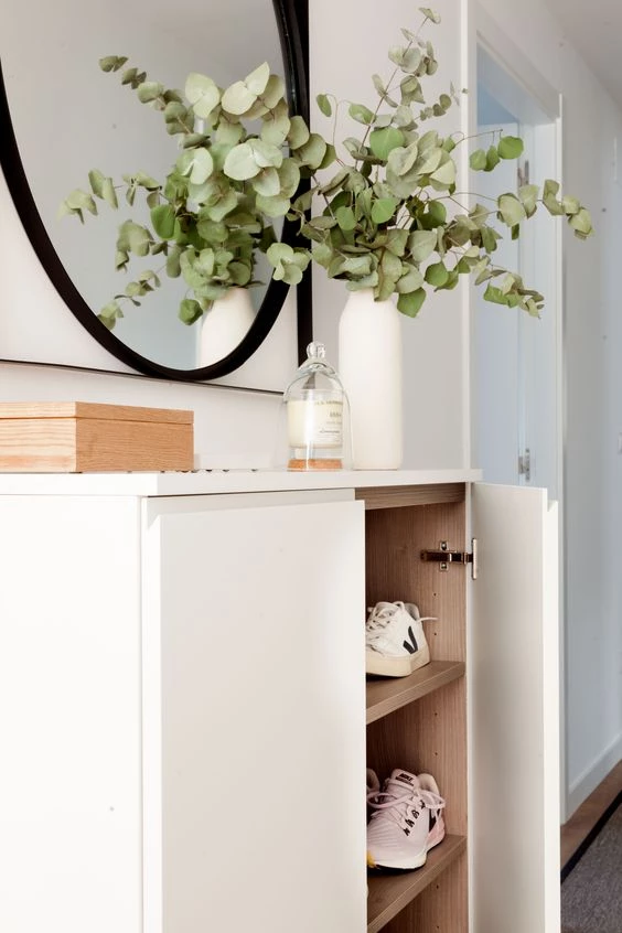 Los muebles estrechos con módulos cerrados no pueden faltar. Así se trate de un recibidor pequeño o grande, estos mobiliarios resultan ser súper funcionales para mantener el orden -cuentan con cajones cerrados para almacenar diferentes elementos- y también sirven como una superficie extra para colocar algunos detalles decorativos que suman un plus.