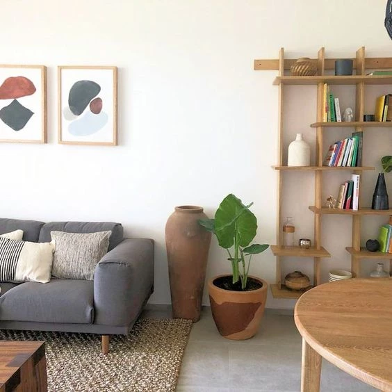 Otro de los objetos que puede marcar la diferencia en un living es una biblioteca o estantes flotantes. Podés sumar diferentes elementos como libros, jarrones hechos a mano, plantas colgantes, cuadros, etc. Y en cuanto al material, nada mejor que ir por un modelo similar al resto del mobiliario.