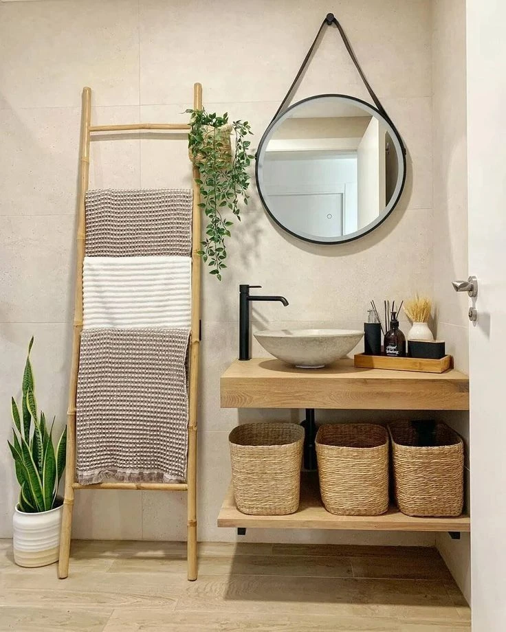 ¿Un simple barral? Mejor no. En 2025 se usan toalleros con diseño: de madera, en forma de escalerita, en hierro negro o en dorado. Ocupan poco, quedan divinos y elevan el look general.