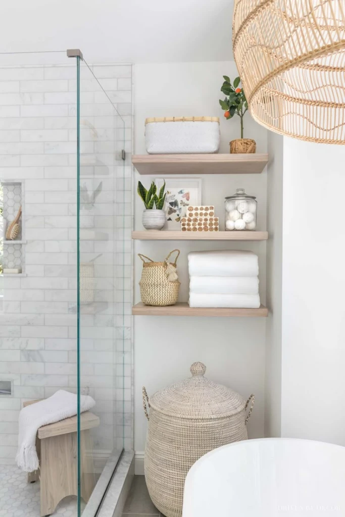 Los estantes flotantes son clave si necesitás orden sin llenar de muebles el espacio. Sirven para apoyar frascos, velas, cremas o una plantita.