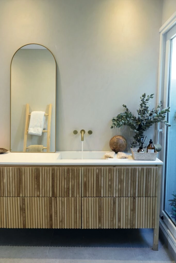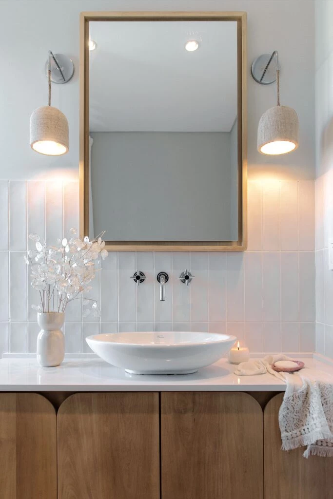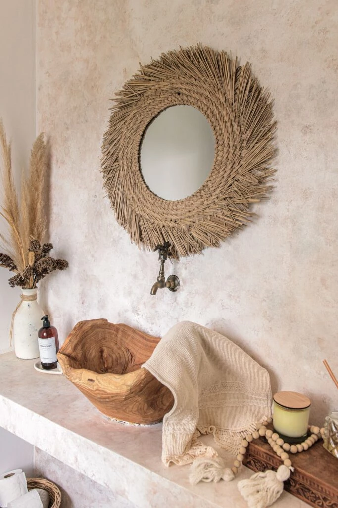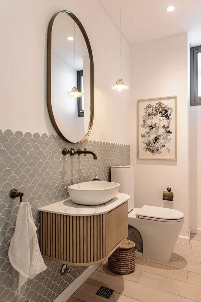 Podés integrar la madera de una forma súper fácil: desde una jabonera o un espejo hasta un florero, un banquito auxiliar o un mueble. ¡Todo vale!