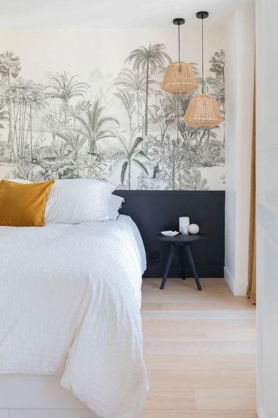 Para darle una impronta personal única a la pared sobre la que se respalda la cama, los papeles murales son ideales. Con motivos botánicos, dibujos geométricos, diseños abstractos... La variedad de diseños que ofrece el mercado actual es muy amplia por lo que hay para todos los gustos y estilos. Eso sí, se recomienda usarlos sólo sobre esa pared para evitar sobrecargar demasiado al ambiente.