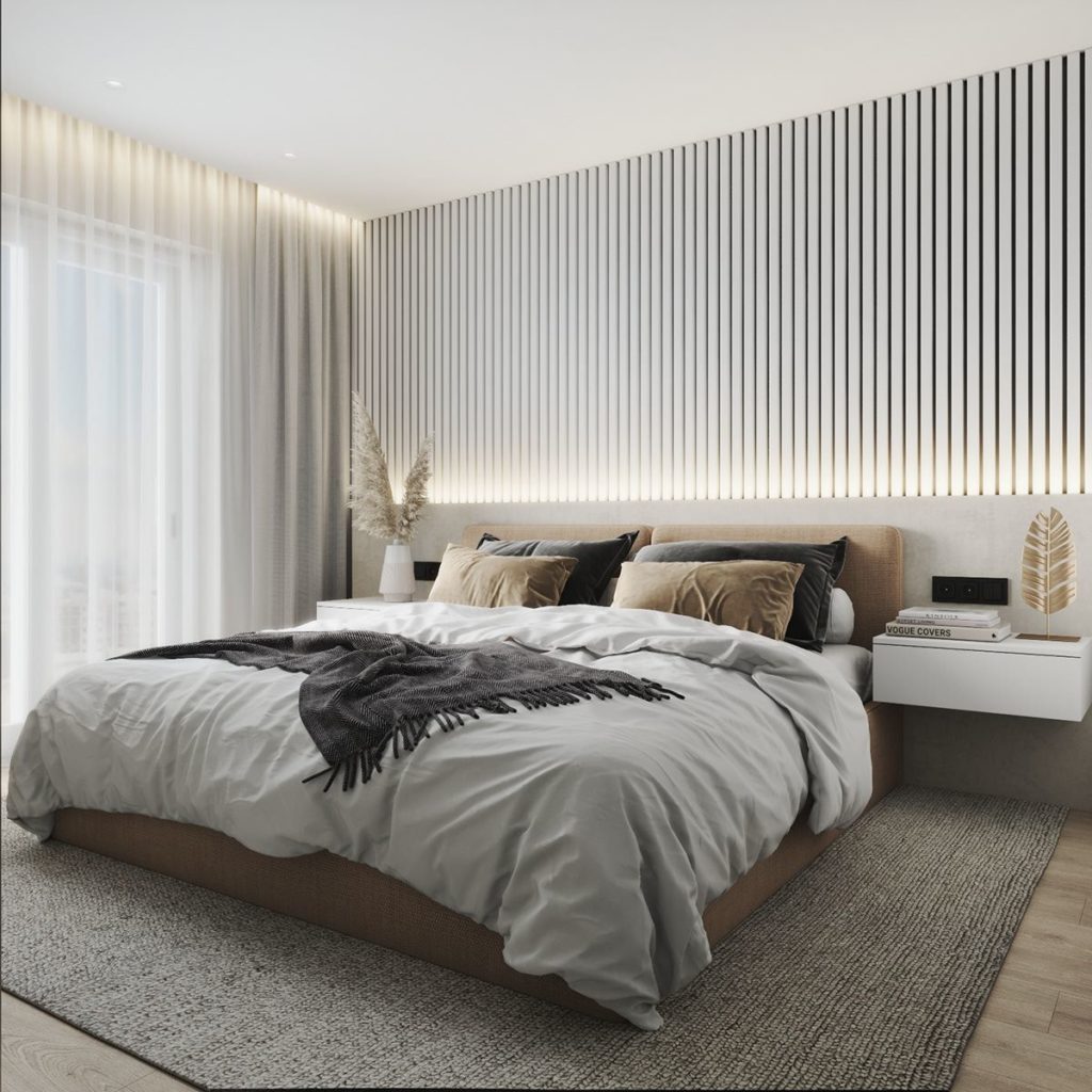 Este revestimiento fue un auténtico boom en 2021 y este año también se consagra como uno de los más elegidos. La madera será la encargada de llevar un toque de calidez, naturalidad y estilo propio al dormitorio, y si se coloca en vertical tapizando todo el muro, elevan visualmente la altura del cielorraso contribuyendo a que el espacio luzca más amplio. Se le pueden sumar luces LED o RGB para retroiluminarlos y realzarlos aún más.