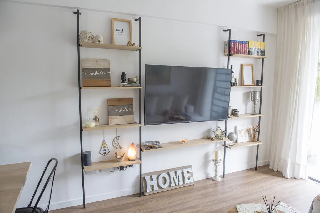 Otra opción -si te gusta tener muchos objetos decorativos, libros o necesitas más almacenaje- es decorar en vertical en lugar de en horizontal. Y es que las paredes, a veces, ofrecen mucho más espacio que el suelo.