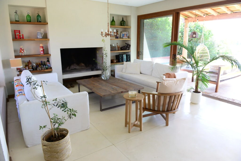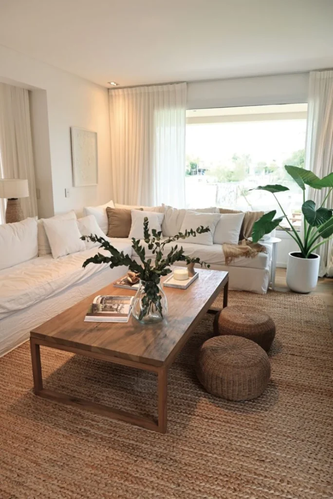 Podés incorporar una alfombra ligera, un canasto para guardar mantas livianas o revisteros en estos materiales. Son detalles que suman calidez y frescura al mismo tiempo.