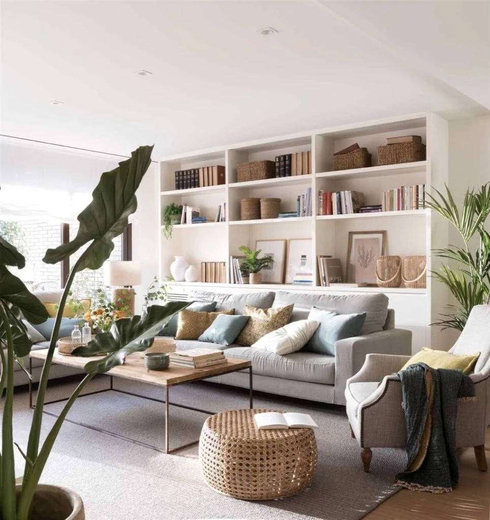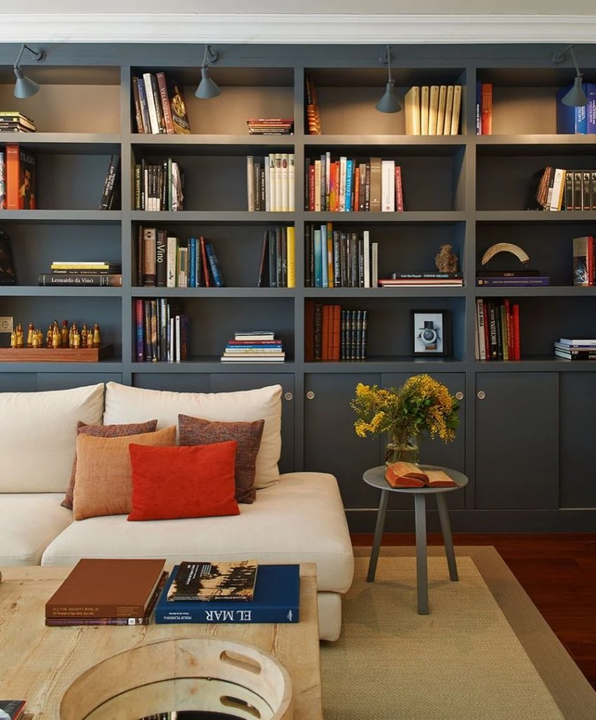 Si preferís que la pared de atrás del sofá no sólo tengo un rol decorativo sino que también sea práctica, colocá allí una gran biblioteca de piso a techo. Podés elegirla en el mismo color que paredes y techo, para que se mimetice, o en uno bien contrastante que la realce. Si es un mueble con puertas, será mejor que éstas sean corredizas, para no dificultar su apertura. Lo importante es mantener cierto orden en los estantes, ya que serán un punto de atención.