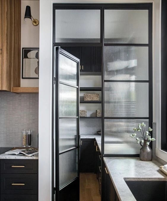 El vidrio transparente clásico se transforma. Ahora se usa con textura: esmerilado, acanalado o rayado, especialmente en separadores de ambientes, puertas de placard o luminarias. Deja pasar la luz, pero da privacidad y diseño.