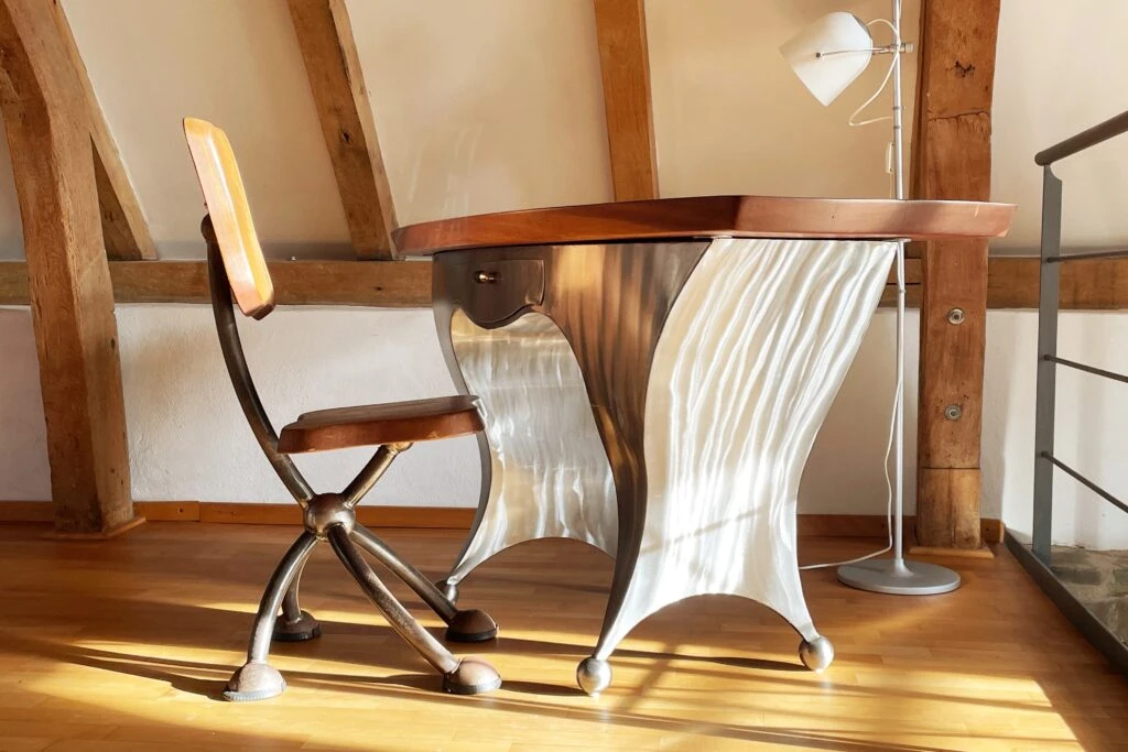 En el 2024, aún se sigue utilizando metal, ya sea hierro, aluminio o latón, en muebles y detalles decorativos. Su presencia en un espacio siempre resulta rompedora, como lo demuestra el escritorio construido en metal y madera del alojamiento de Sylvia Maria, anfitriona en Airbnb en Alemania.
