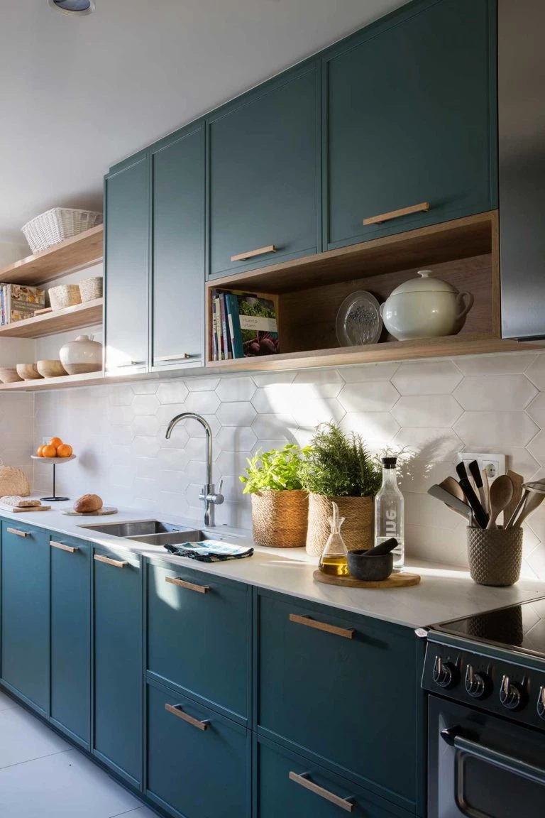 Si bien la madera y el clásico blanco siguen presentes en este espacio de la casa, los colores más oscuros como negro, grafito y azul noche cobran protagonismo y se convierten en los nuevos favoritos para imprimirle a la cocina un look más elegante y actual.