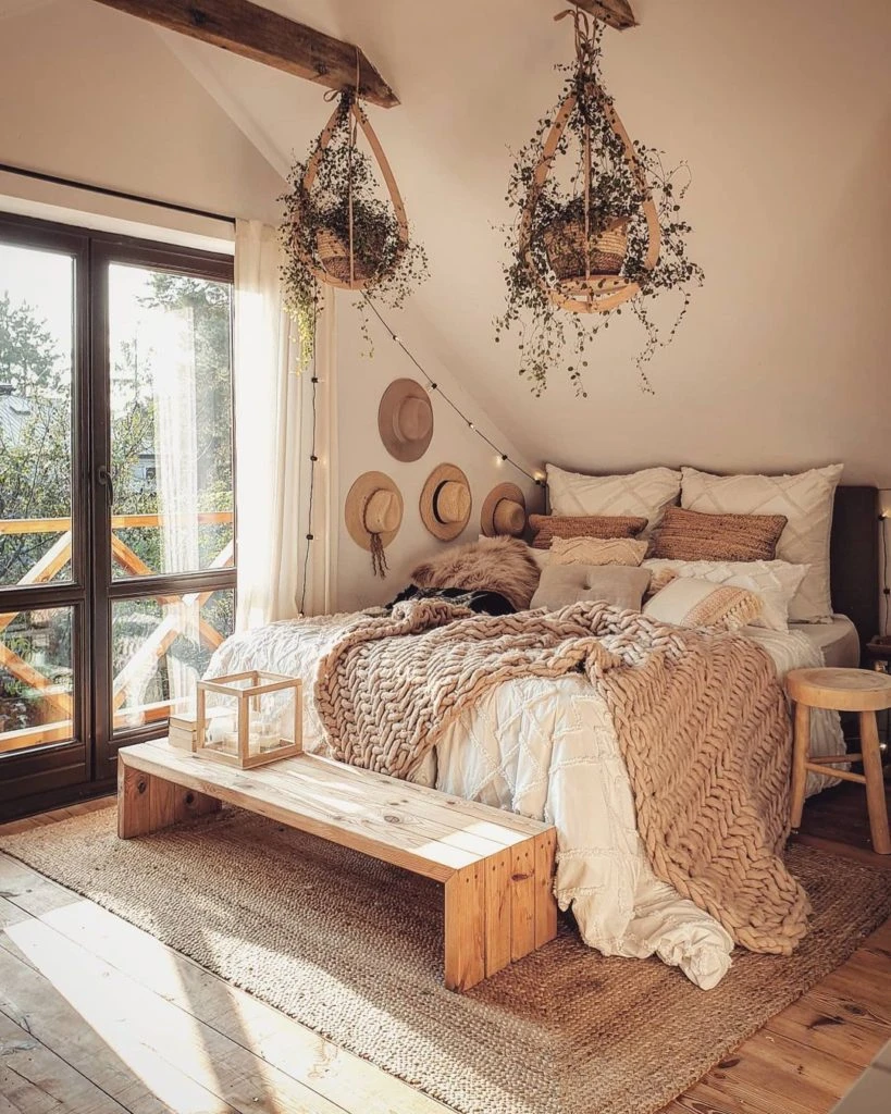 Tejidos gordos para echar a los pies de la cama, cuadros, plantas, guirnaldas de luces, muebles y accesorios en fibras naturales (mimbre, rattan, rafia), plantas de interior y alfombras, son entre otros los temas que más se repiten en estos dormitorios que son motor de búsqueda