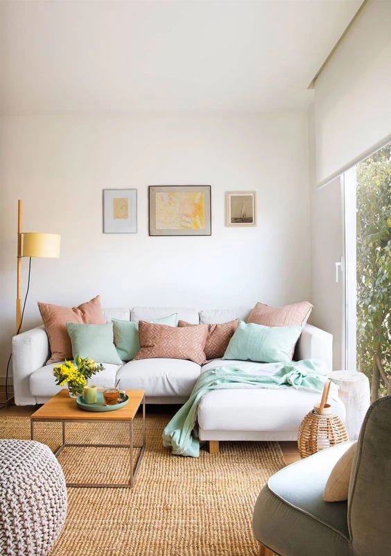 Por regla general, los colores claros son grandes aliados para iluminar y ampliar visualmente cualquier espacio reducido. Blanco, beige, crema y tonos pasteles son una opción súper válida para livings, ya que son colores que están de moda esta temporada.
