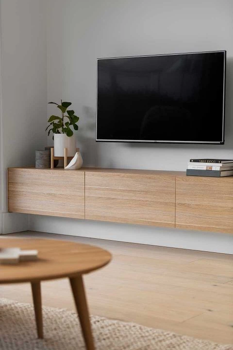 Los muebles suspendidos o 'flotantes' son ideales para alivianar visualmente un espacio chico. Y si a esta característica le sumamos que sean de líneas simples, el resultado será aún más armónico, brindando una sensación de ligereza visual y contribuyendo a que el living parezca más amplio de lo que en realidad es.