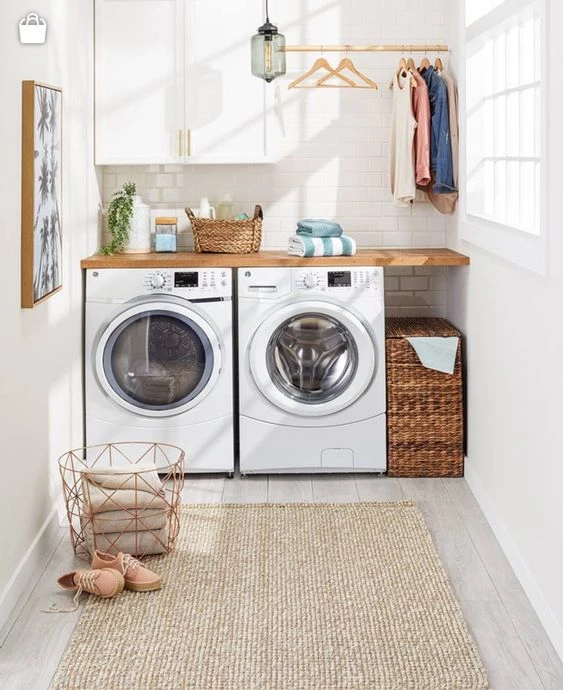 Un must que no puede faltar en un lavadero: el tender. Podés colocar un barral encima de la mesada para colgar camisas y prendas delicadas, o aprovechar las paredes para poner tenders plegables y ganar más espacio y comodidad.