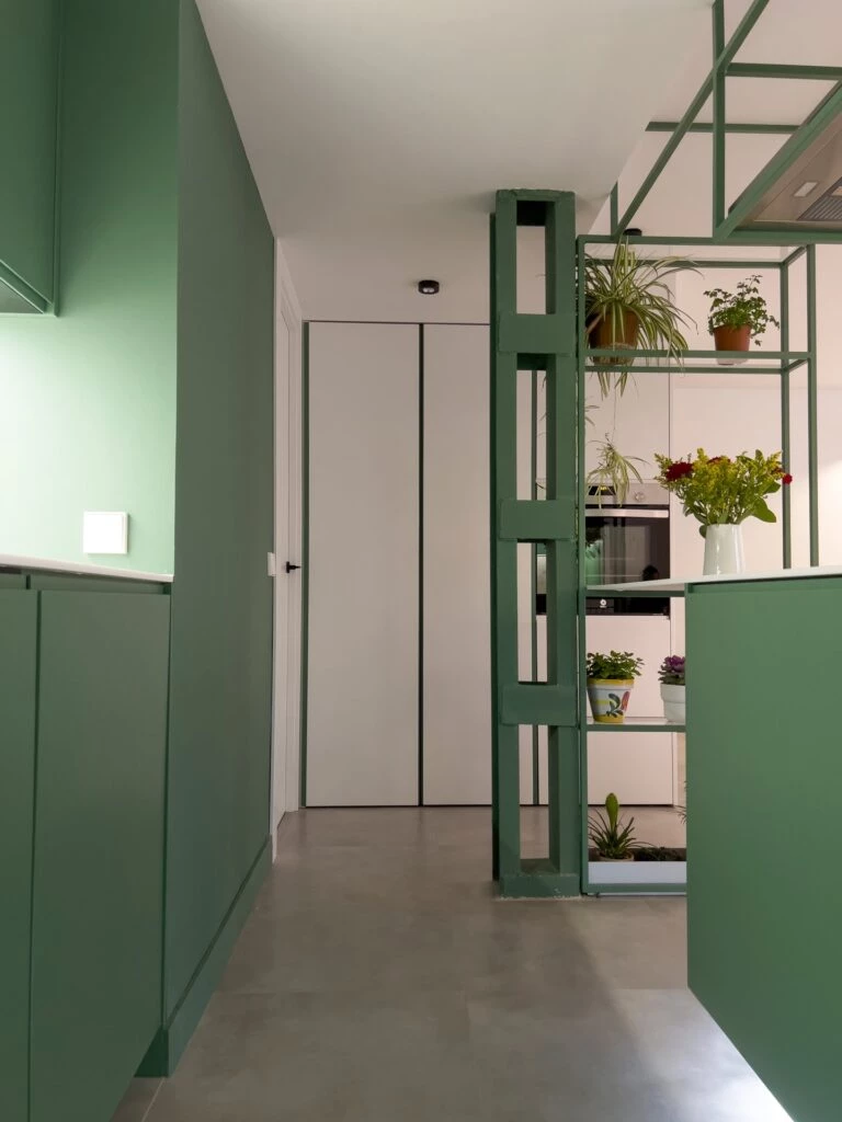 En todo el diseño de la carpintería fue muy importante enfatizar ese juego de líneas, marcadas con madera en el plano horizontal y con verde en el plano vertical.