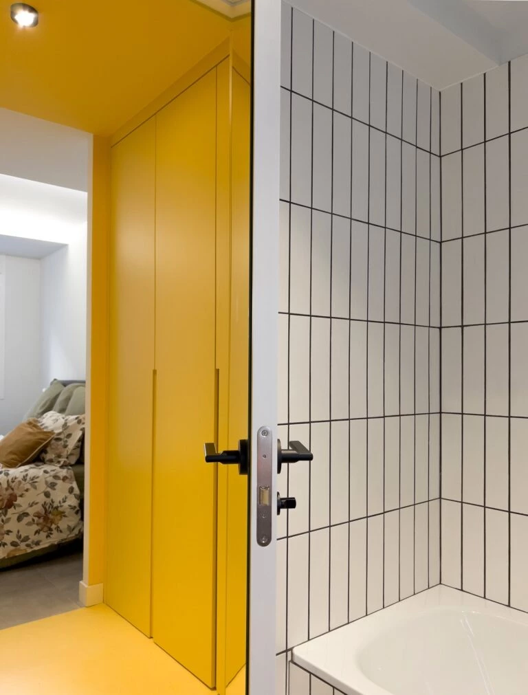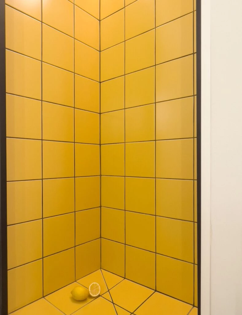 Un azulejo cerámico con juntas oscuras aporta carácter e identidad a los espacios húmedos. Blanco VS negro y amarillo son los colores elegidos.