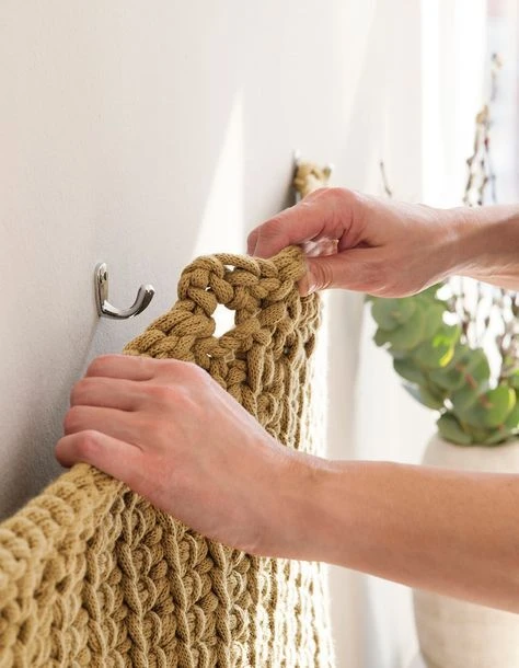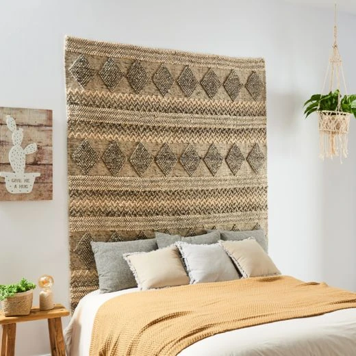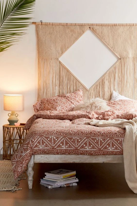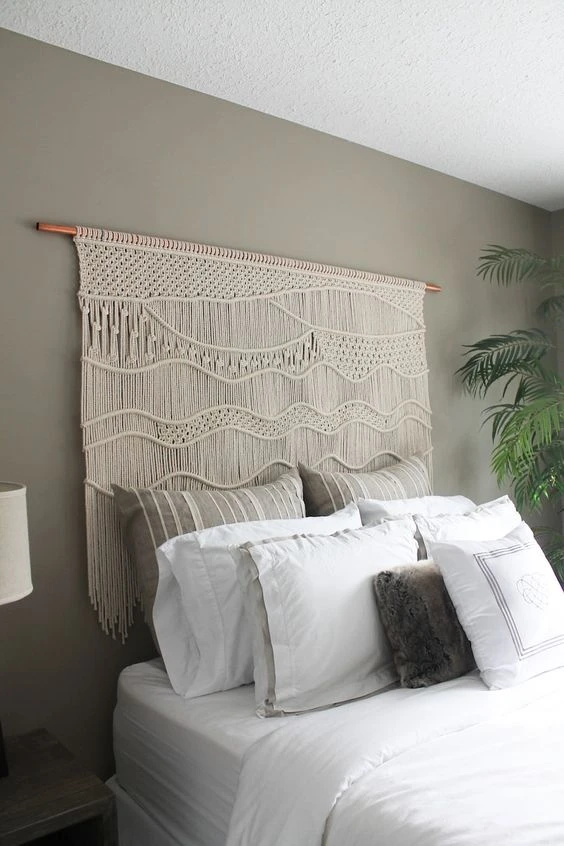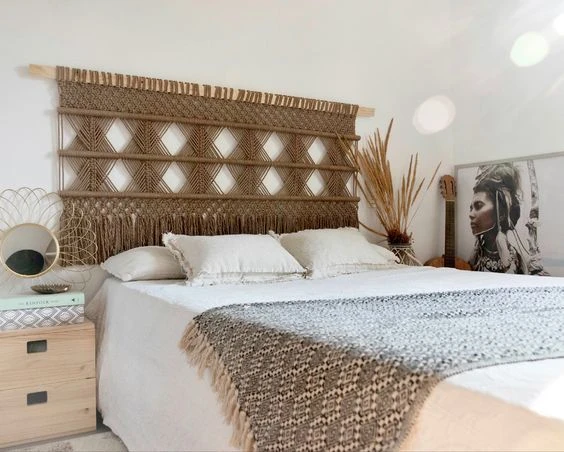 Los tapices de macramé están de moda y quedan divinos en la pared cabecera del dormitorio.