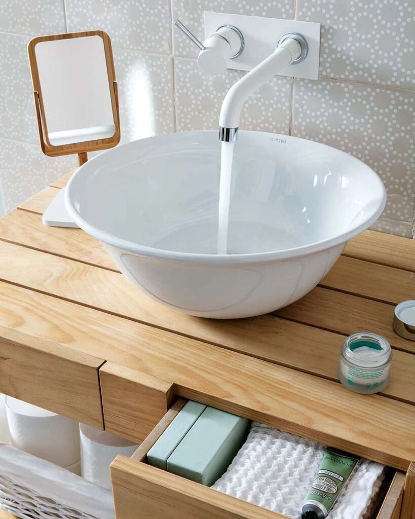 Ya sea empotrada en la pared -ideales cuando hay poca superficie o en lavabos mini- o para un mueble de baño, una grifería blanca hará que el espacio resulte más elegante y estiloso.