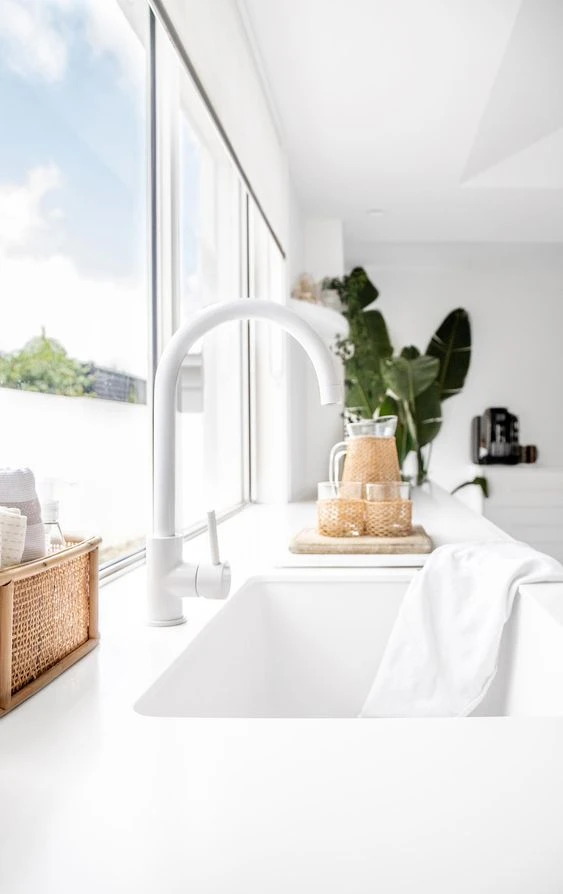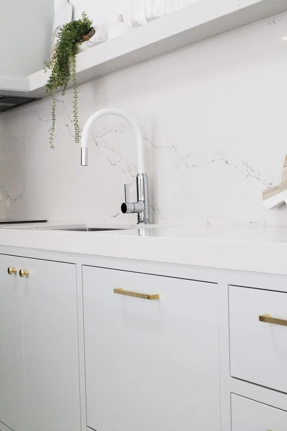 Por último, para cocinas y baños glam, nada mejor que las griferías blancas pero con detalles dorados.