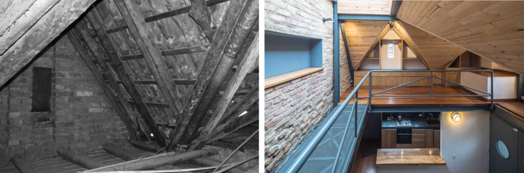 La rehabilitación de esta casa consistió en la demolición interior del espacio, que para entonces se utilizaba como bodega, cambiando los niveles y ocupando el espacio triangular que conforman las cubiertas de 45 grados de pendiente.
