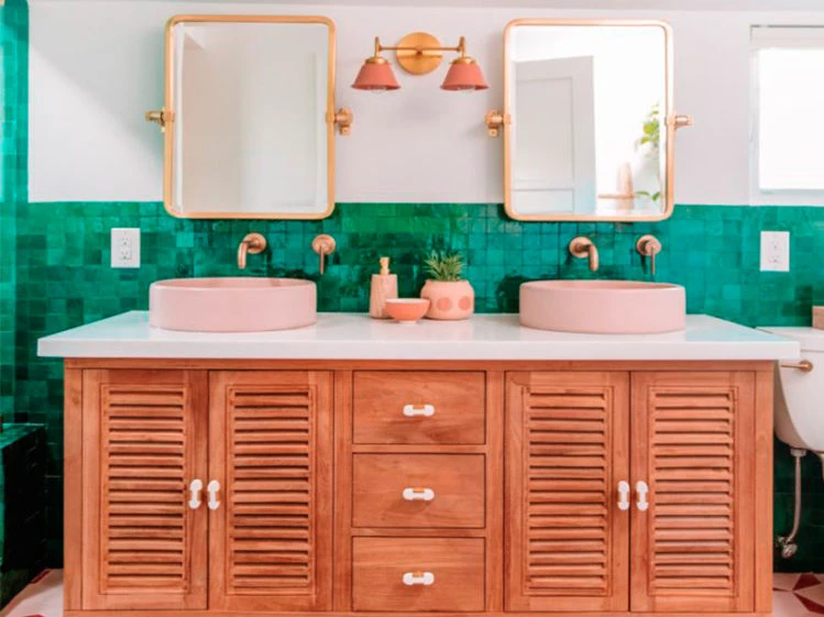 "Las baldosas del piso fue lo primero que elegimos a la hora de renovar este espacio. Todo lo demás se fue dando a partir de ellas. Si bien sabía que quería jugar con algunos tonos como rosa y melocotón, también buscaba algo diferente. Y así fue que se me ocurrió incorporar el verde intenso a través de los azulejos zellige", comienza explicando Kelly en su blog Studio DIY.
