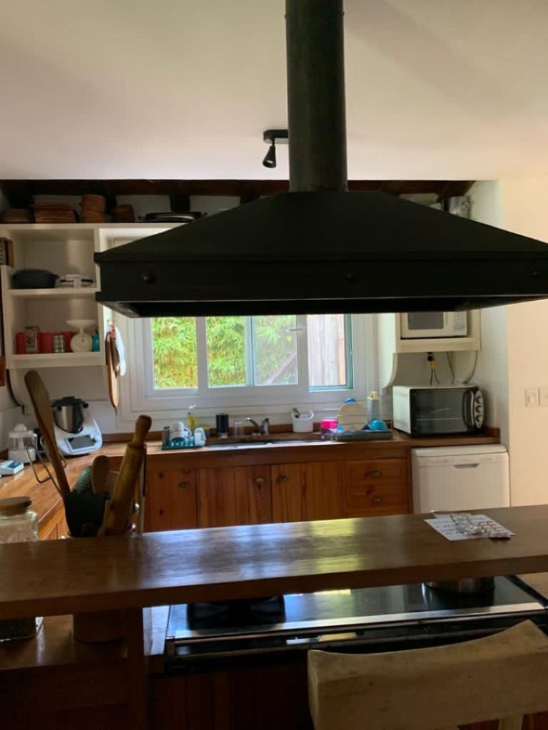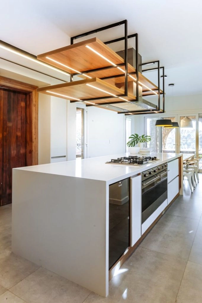 Sobre la isla de trabajo con mesada de Dekton blanco, una estantería colgante de hierro con estantes de madera maciza alberga la campana extractora y genera mas espacio de apoyo para enseres y utensilios.