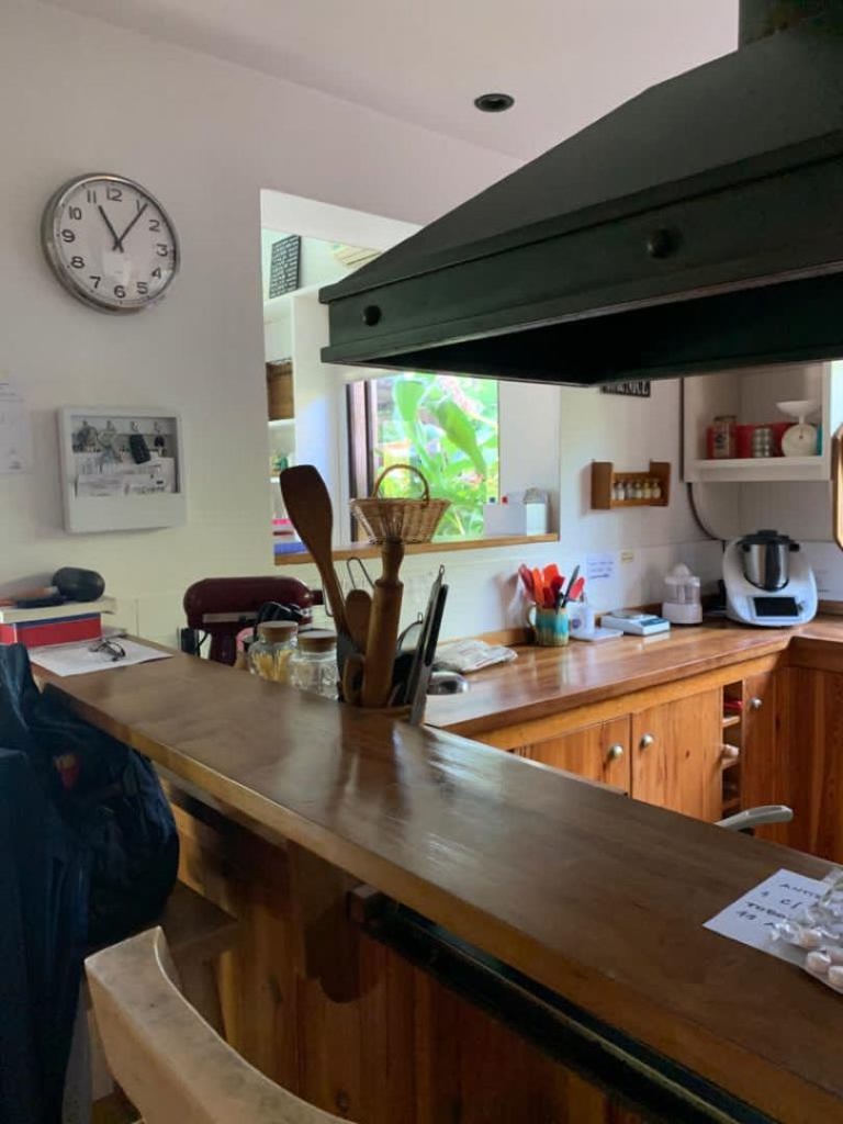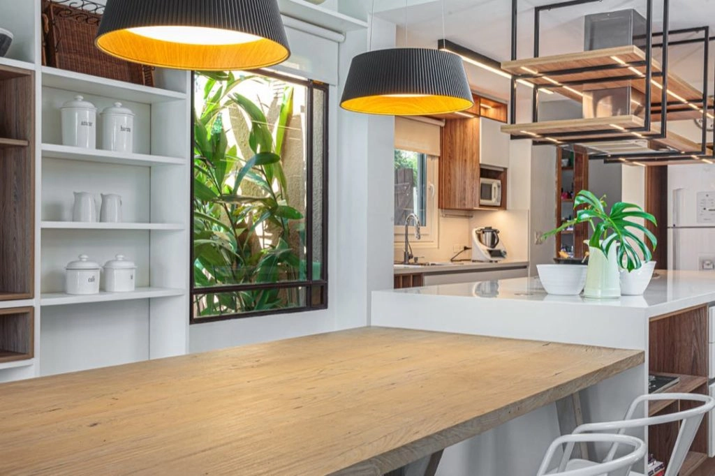 La mesada se continua hacia el comedor diario con una gran mesa de madera maciza, para 8 comensales.