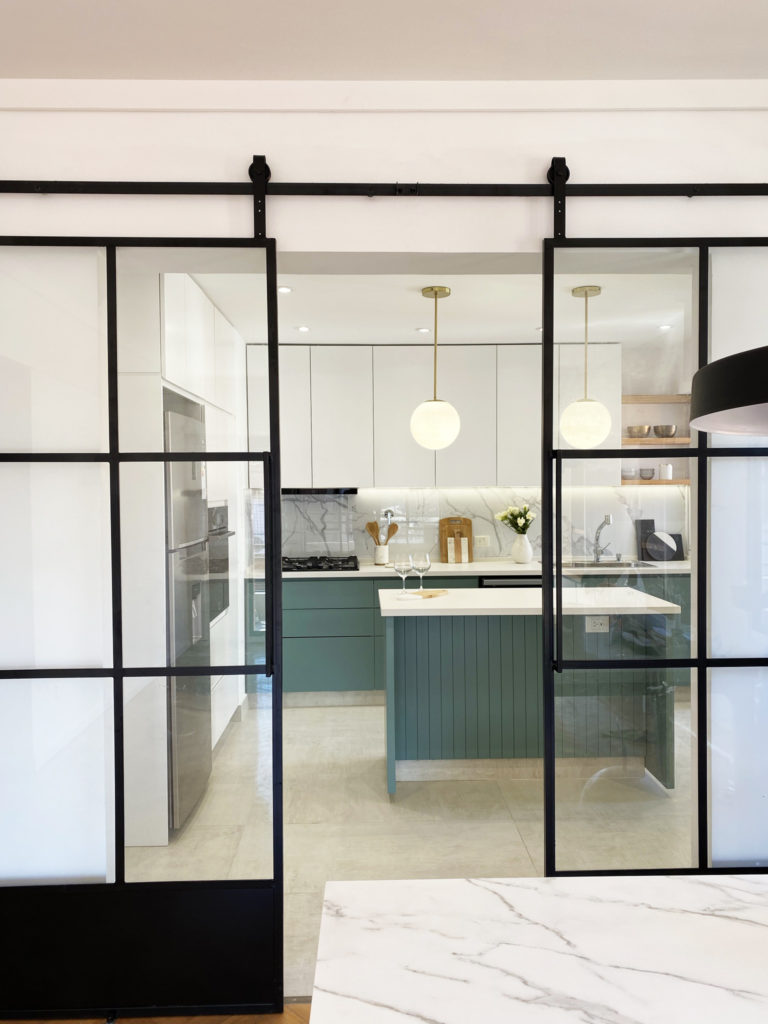 Siguiendo con un estilo de decoración contemporáneo, la cocina tiene como protagonista indiscutido al color verde azulado, el cual se complementó con detalles en negro y dorado para más sofisticación, dando como resultado un espacio muy moderno y elegante.