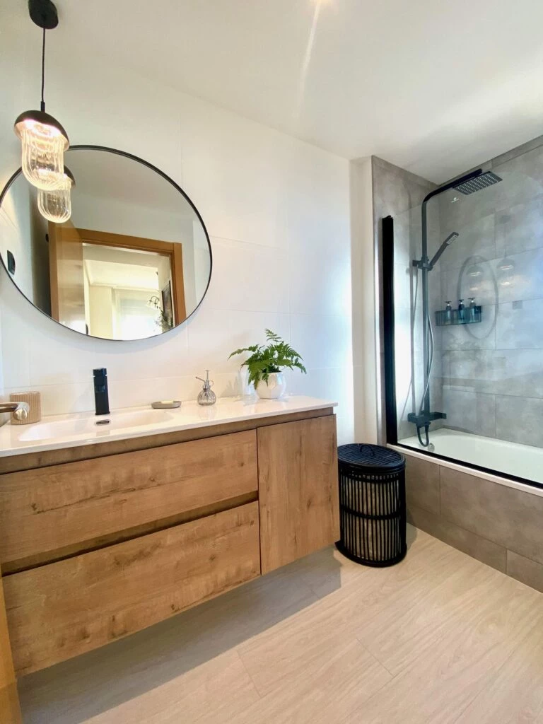La bañera se conservó tal cual, pero para darle un mejor uso y modernidad, se le instaló una buena grifería en color negro mate (muy tendencia) y una mampara transparente de una sola hoja con terminaciones en negro, generando así un plus de luminosidad y amplitud visual. Para las paredes de esta zona se optó por un revestimiento vinílico símil porcelanato.