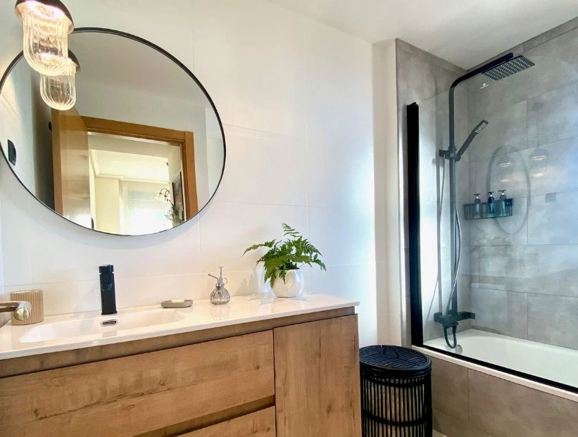 La bañera se conservó tal cual, pero para darle un mejor uso y modernidad, se le instaló una buena grifería en color negro mate (muy tendencia) y una mampara transparente de una sola hoja con terminaciones en negro, generando así un plus de luminosidad y amplitud visual. Para las paredes de esta zona se optó por un revestimiento vinílico símil porcelanato.