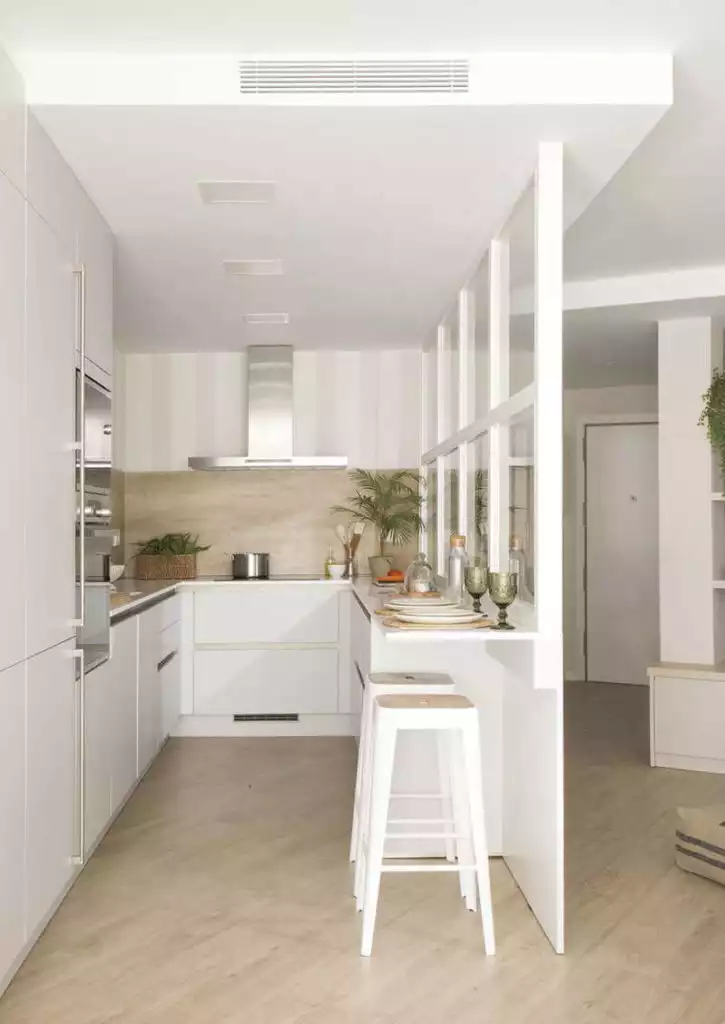 Se colocó una barra desayunadora para ganar más espacio y funcionalidad, al igual que diferentes electrodomésticos empotrados en las paredes.