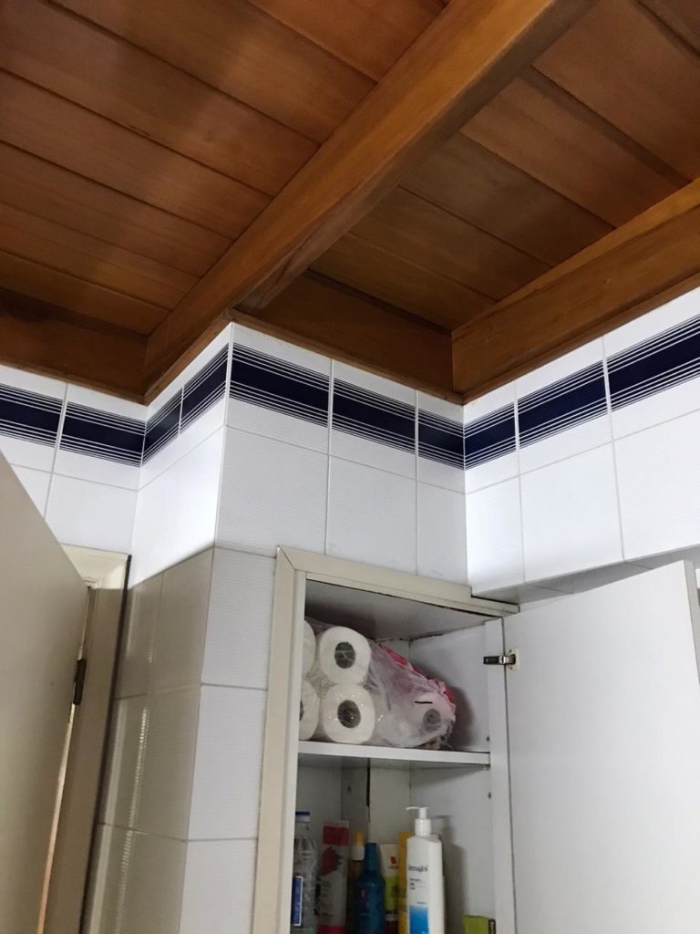 "Si había algo que me impactó desde el momento en que vi el baño original, fue su cielorraso. El estado de la madera y el color de la misma, eran perfectos y era toda la calidez que necesitábamos para que la combinación con los blancos, grises y negros fuera perfecta", recuerda Ornella.