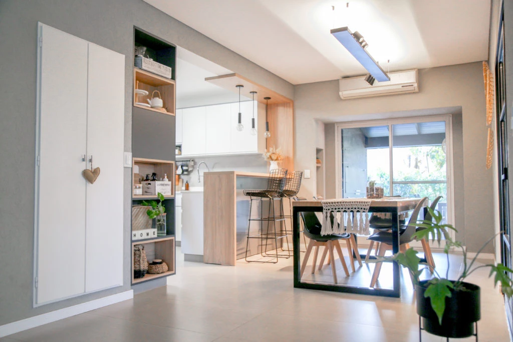 Este espacio de la casa tenía un enorme potencial que no se estaba aprovechando. Lo primero que se hizo fue cambiar los pisos antiguos por unos más modernos de porcelanto gris, luego se cambiaron las aberturas por unas de hierro y vidrio repartido que son tendencia esta temporada. Se colocó una barra de madera clara ganando funcionalidad junto dos banquetas, perfecta para un desayuno express.