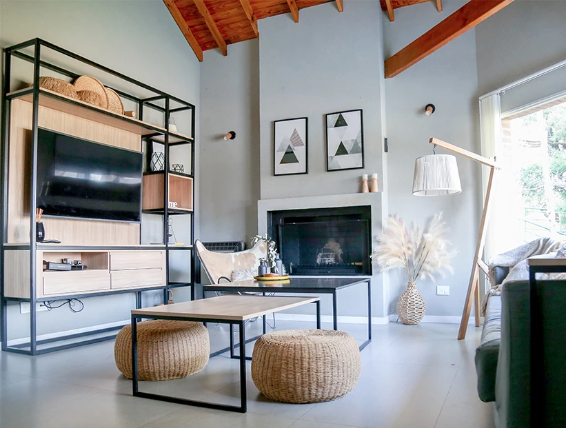 Al igual que el comedor, este ambiente contaba con un enorme potencial que no se estaba explotando en su totalidad. El ladrillo visto hacía que este espacio luzca más oscuro y reducido por eso se optó por reemplazarlo por un revestimiento texturado en la gama de los grises. Los techos de madera se dejaron intactos para ganar calidez. Se utilizaron muebles modernos de hierro con estructuras vistas y enchapados en tonos madera y gris grafito.