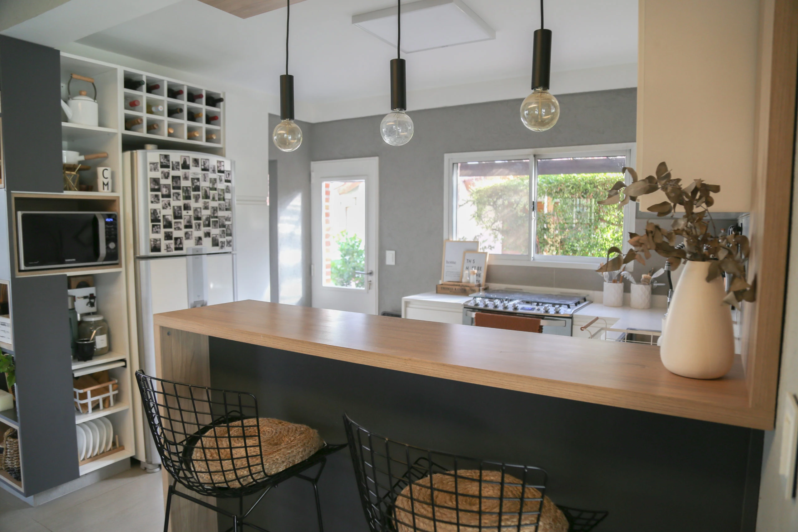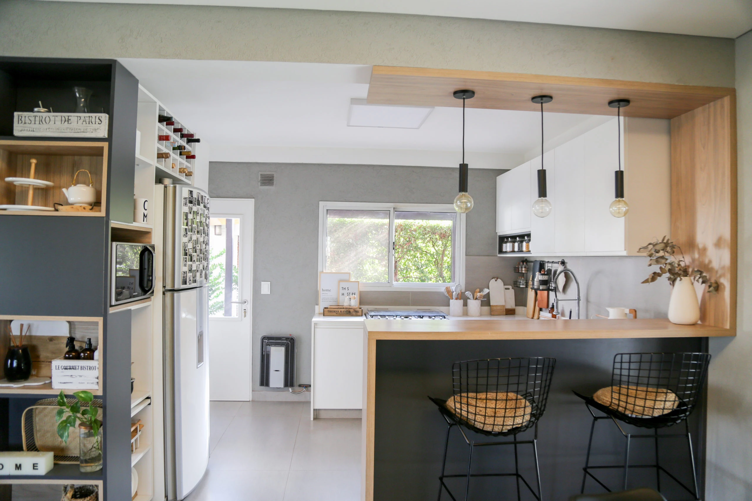 La barra con banquetas y luces de diseño colgantes, conquistan el sector otorgándole un toque súper canchero y actual.