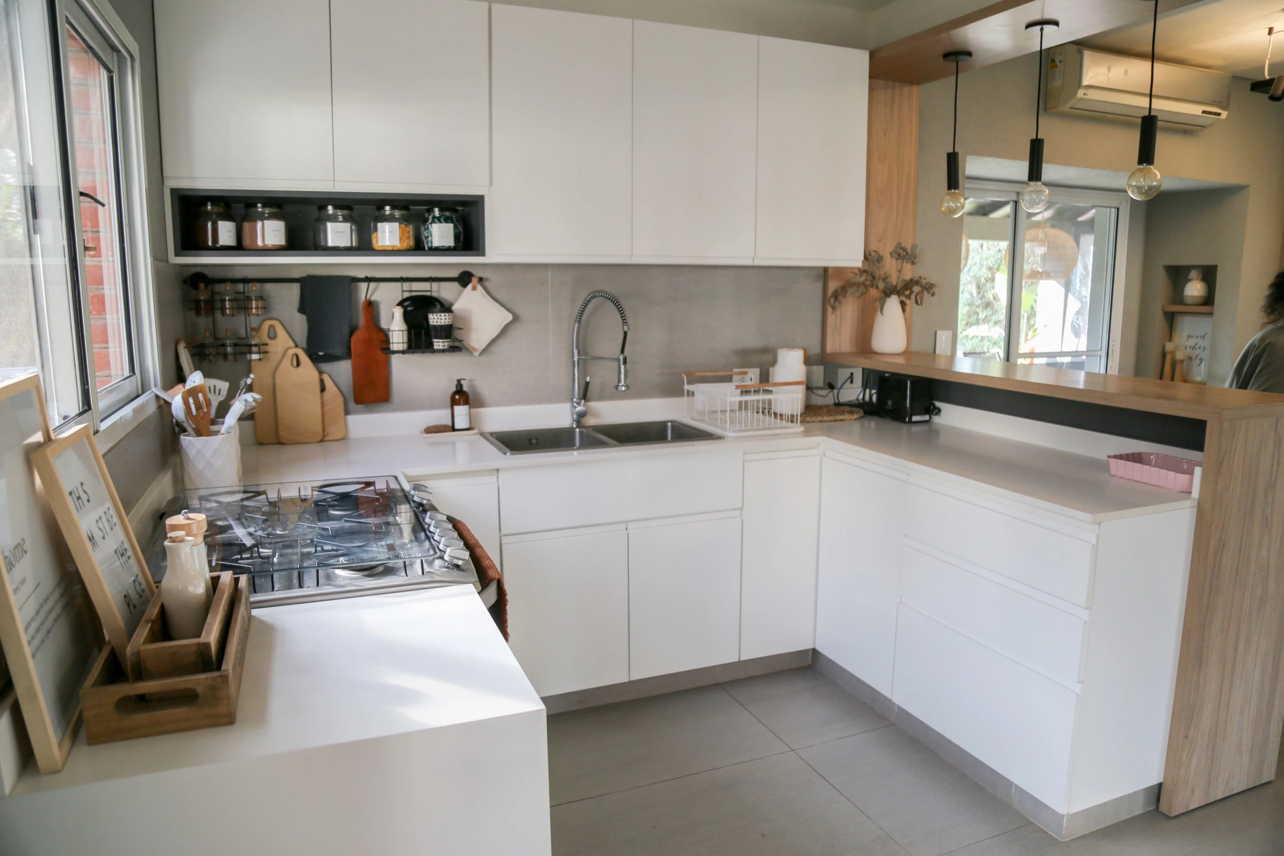 A grandes rasgos, lo que se hizo fue armar una cocina en forma de "U" con un cómodo espacio para cocinar y con buen lugar de almacenamiento para guardar los diferentes elementos necesarios.