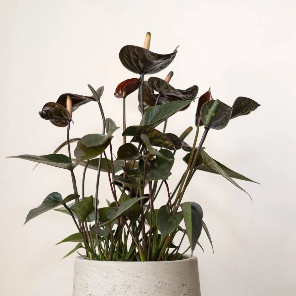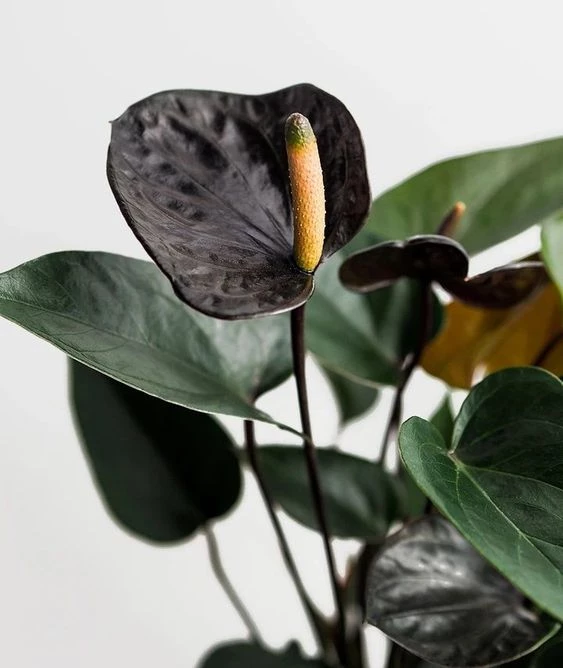 Aunque sus hojas son verdes, lo más llamativo de cualquier anturio son siempre sus hojas de color con inflorescencias. Si bien las más populares son rojas o lilas, hay muchas variantes, como es el caso de la variedad Anthurium 'black love'.