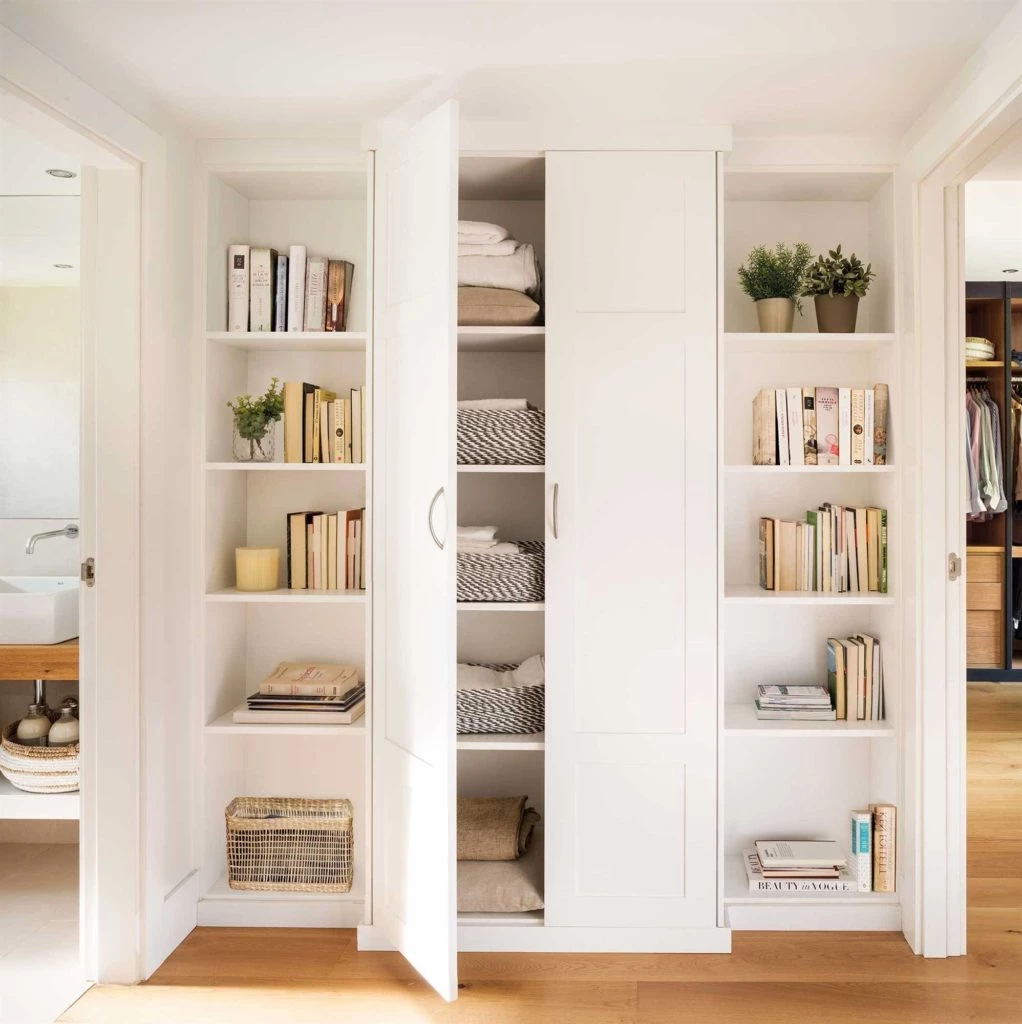Lo más recomendado es apostar por una zona alta con estantes que funcione como almacenaje para guardar la ropa de otras temporadas o aquellas prendas y objetos que no se utilicen habitualmente. Y a no olvidarse de los múltiples cajones y espacios para guardar ropa doblada y prendas largas que van mejor colgadas en perchas.
