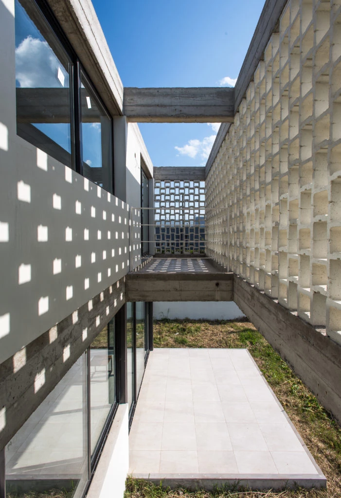Una planta alta introvertida establece relaciones tamizadas con el afuera, recortadas por el bloque de hormigón, dando lugar al desarrollo de las funciones más privadas.