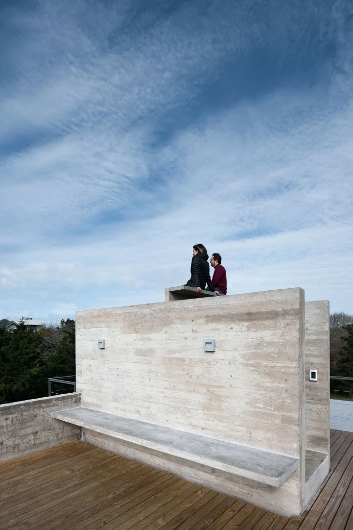 El paramento vertical que arma el sector de parrilla cumple a su vez la función de proteger a la expansión semicubierta y al sector de estar del sol horizontal del oeste. Tabiques verticales penden de la losa sobre primer piso para, igualmente, lograr proteger del sol al dormitorio principal, así como de las vistas cruzadas desde el deck.